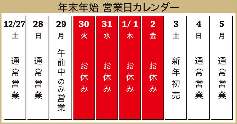 | 店休日 | 2025年12月30日(火)~2026年1月2日(金) | 年末年始休業 | |