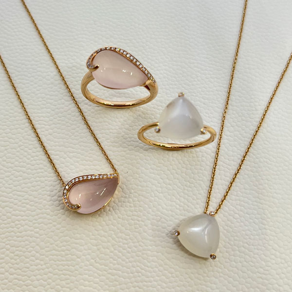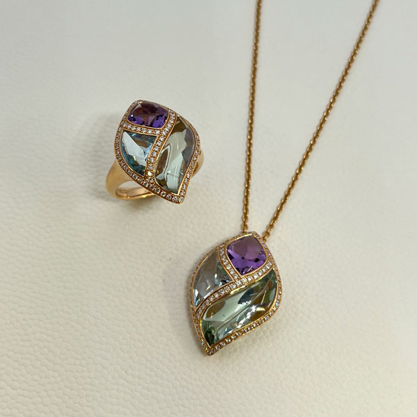 宝石の色づかい、カッティング等、随所にヨーロッパらしさが薫る流麗なジュエリー
